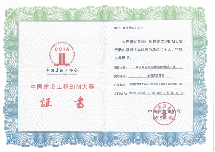12月29日,首屆中國(guó)建設(shè)工程BIM大賽頒獎(jiǎng)暨表彰大會(huì)在??谂e行,集團(tuán)兩項(xiàng)成果獲獎(jiǎng),其中“BIM技術(shù)在濟(jì)南市唐冶新區(qū)市政工程中的應(yīng)用”獲得二等獎(jiǎng),“順河高架南延項(xiàng)目BIM解決方案”獲得三等獎(jiǎng);另外,“BIM技術(shù)在分離式立交工程中的應(yīng)用——青島長(zhǎng)江路與昆侖山路立交”得到書(shū)面表彰。