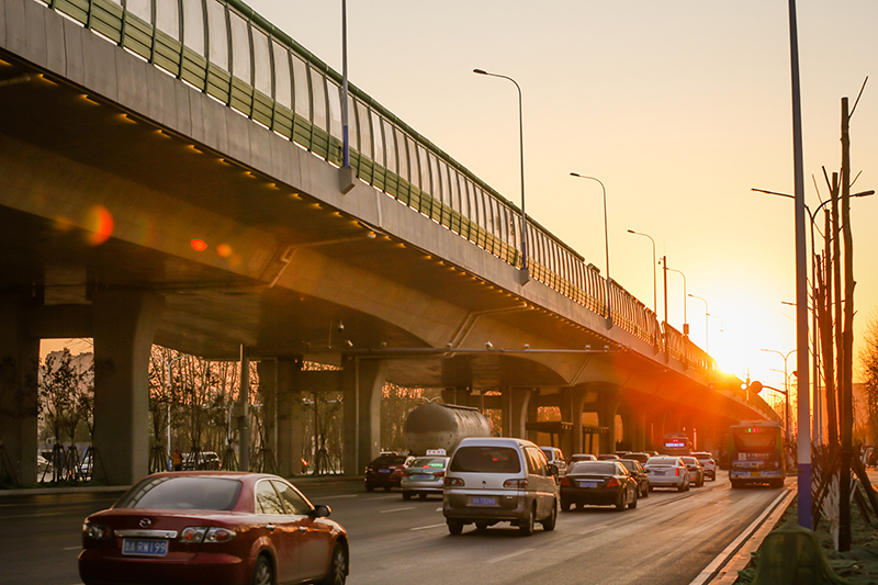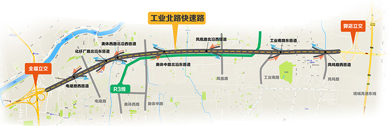 工業(yè)北路快速路西起全福立交橋,東至郭店立交,長13.6公里,標準段寬25.5米,雙向6車道。沿線共設置8對匝道,其中7對實現(xiàn)高架橋梁與地面道路的連接,在郭店立交設置一對專用匝道實現(xiàn)高快轉換。