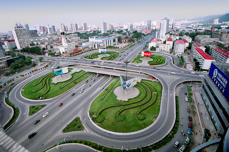 為苜蓿葉形三層互通式立交,兩條主干路均寬 50 米,橋梁上部采用簡支箱梁,寬腹 T 梁及三孔連續(xù)板結構,預制安裝,施工簡單;下部蓋梁為暗藏式,墩身采用蝙蝠式柱,外形美觀;基礎為鋼筋砼擴大基礎及灌注樁;該立交充分利用原有排水系統(tǒng),雨污水完全自流,經(jīng)濟合理。榮獲市長金杯獎,被評為泉城十大景觀之首。